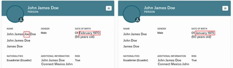 As seen in the Maxsight™ Investigations platform, multiple entities or individuals may have the same names or similar identifiers. You can compare detailed profile data to de-duplicate initial results before expanding your investigation map.