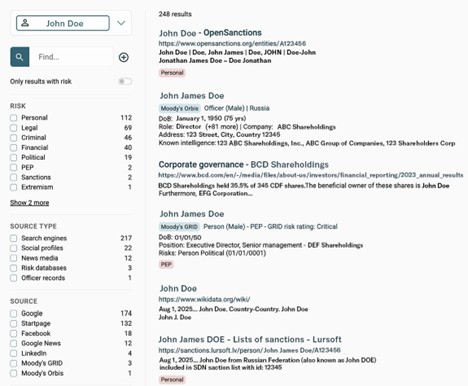 While OSINT data aggregators can provide investigators and analysts with access to large amounts of structured data on entities, it is important to find tools that can go one step further by displaying potential relationships between entities and types of risk associated with each entity.